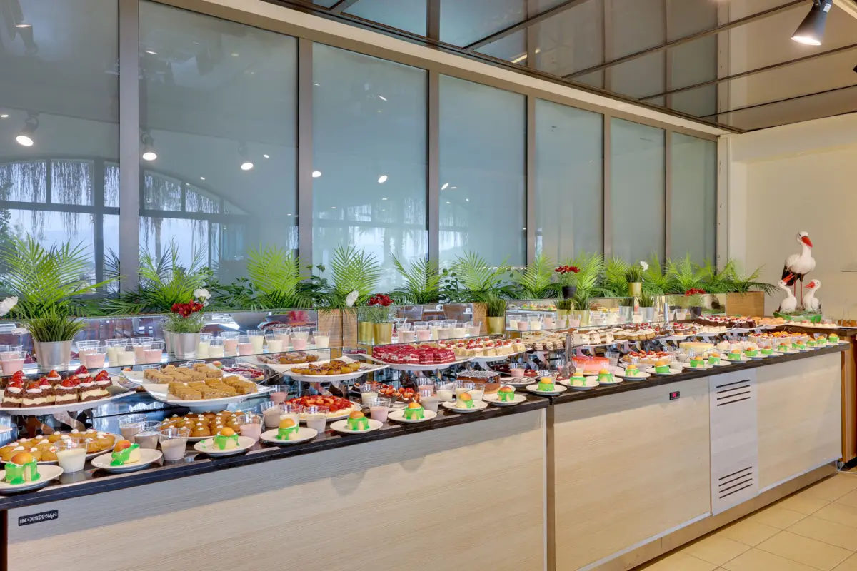 Tesiste 350 kişilik deniz manzaralı restoran bulunmaktadır. Ana restoranımızda kahvaltı, öğle ve akşam yemekleri, açık büfe olarak servis edilmektedir. Snack servis ve gece çorbası ana restoranda servis edilmektedir.